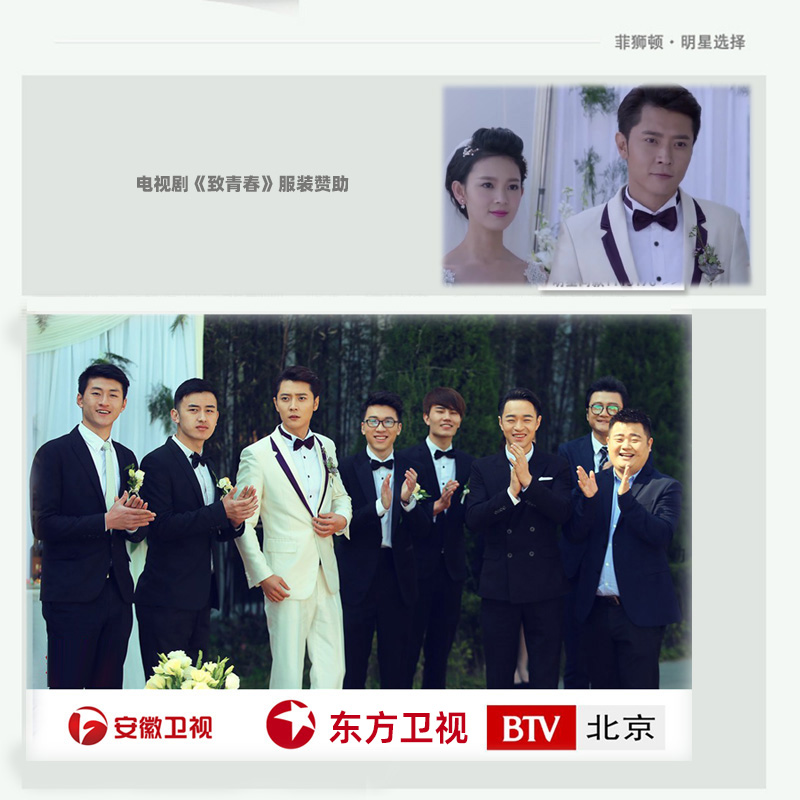 在《致青春》这部剧中,张丹峰身着菲狮顿提供的修身西服套装,无论是正式场合还是日常休闲时刻,都显得既得体又不失风度。特别是那些为婚礼等重要场合准备的多彩结婚礼服系列,更是让张丹峰的角色更加光彩照人。这些服装的设计既保留了传统西服的经典元素,又融入了现代流行的色彩与款式变化,使得整个造型看起来既经典又具有时代感。